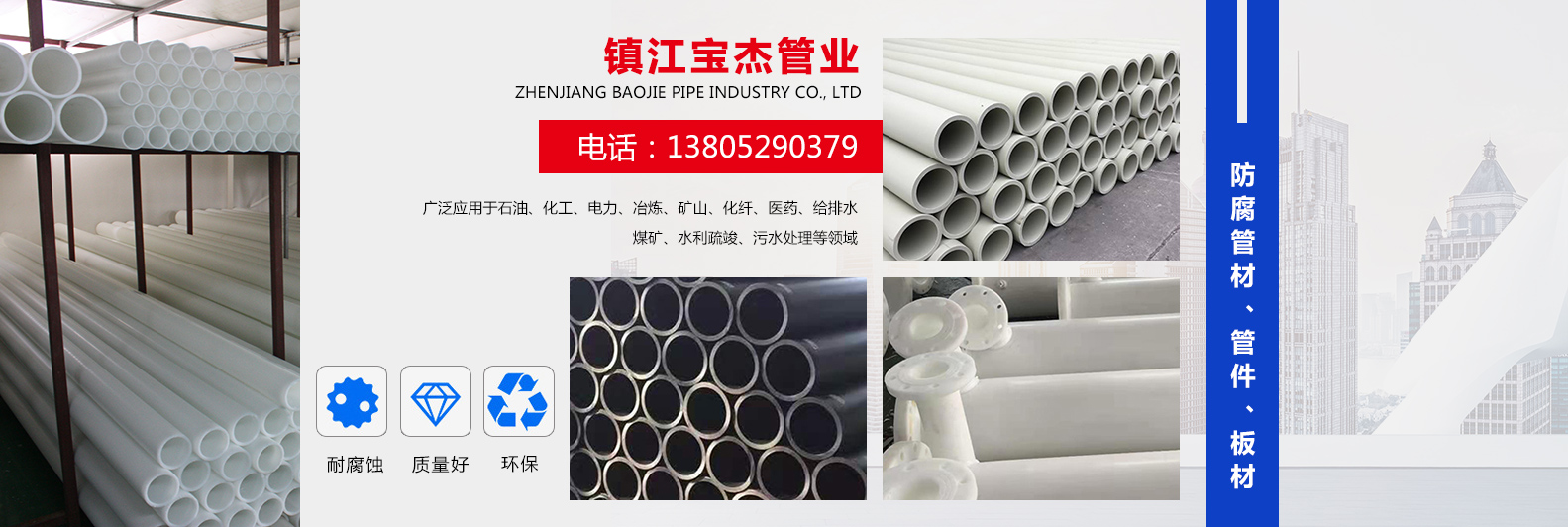 鎮(zhèn)江寶杰管業(yè)有限公司是生產(chǎn)防腐管材、管件、板材的專(zhuān)業(yè)化企業(yè)。